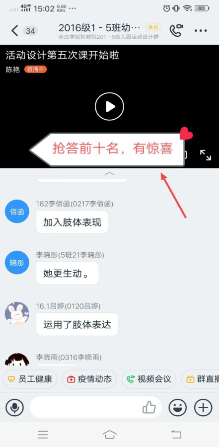 相对于传统的教室面对面授课,在线教学这种新颖的上课方式需要老师创新互动方式,提高同学们听课的积极性。另外,由于初教院的学生,年龄相对其他学院的学生要小一些,注意力容易分散,所以在教学中,陈老师十分注重调动学生的学习积极性,用多种方式如课前签到、抢答、互动群讨论、截图圈划、课堂及时检测、随机给麦、奖励、展示学生优秀作品等,激励学生积极参与到课堂学习中来。