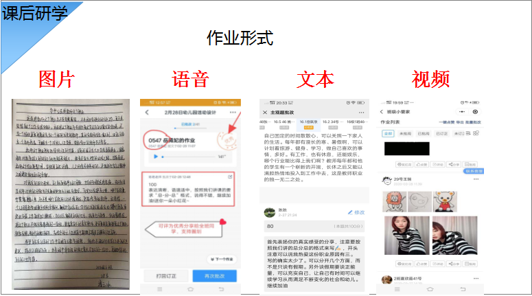 为了保证线上教学效果,提高教学效率,课堂上讲授的重点和难点,课后通过作业检验学习效果。陈老师通过多次实践选择小程序班级小管家,非常适合课程写-说-讲的要求,有利于学生学、练、用结合。教师发布不同形式的作业,学生可以拍照、录音、视频的方式上传,并能随时跟踪学生的作业完成情况。同时在微信班级群互动平台,及时发布课程相关信息,增进课程互动。教师全程在线答疑解惑,拓展课下教学空间,进一步巩固教学效果。