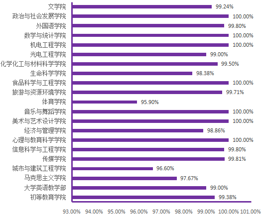 各院(部)的开课数、开课门次、班级数、教师数(人次)、学生数(人次)和学生上课率情况如下图所示: