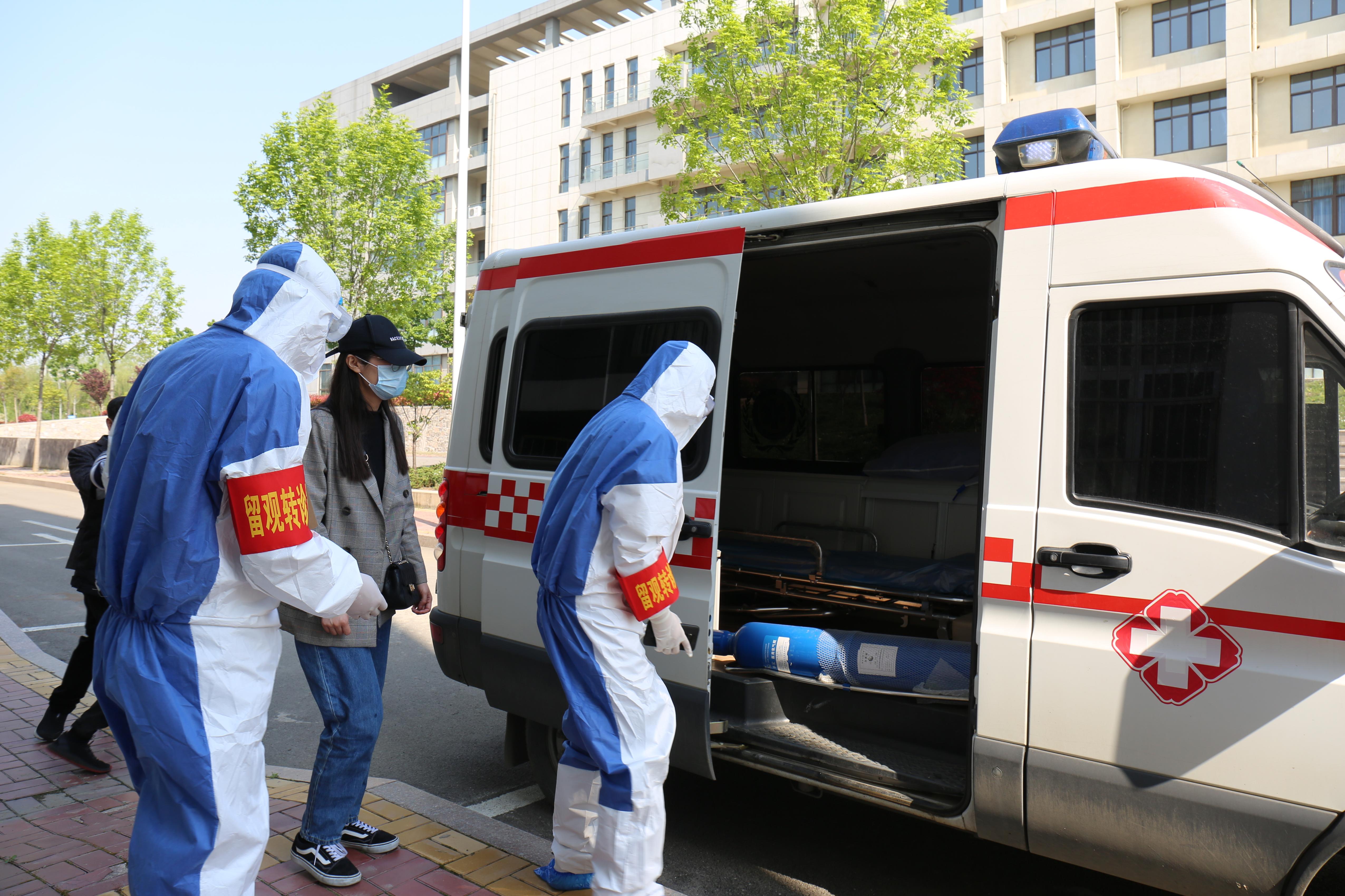 在“学生入校应急演练”环节,由教职工志愿者扮演的返校“学生”佩戴口罩,按照间隔2米有序排成一列。进入消毒区后,消毒区域地面铺有消毒垫对“学生”脚底进行消毒,工作人员对行李进行喷雾消毒。“学生”依次通过自动测温系统时,其中一名“学生”体温显示异常。场地联络员立即将该生引领至临时留观点,留观转诊员对其进行体温复测和症状、流行病学史、旅居史等信息询问,重测体温大于37.3℃,立即启动突发疫情应急处置,留观转诊员电话上报校疫情领导小组汇报情况,并电话联系120救护车到现场。后勤服务组、安全保卫组、学生管理组及综合协调组等工作人员到达现场维持秩序、疏导其他“学生”、协助登记周围人员信息,并对该生经过区域警戒、消毒。