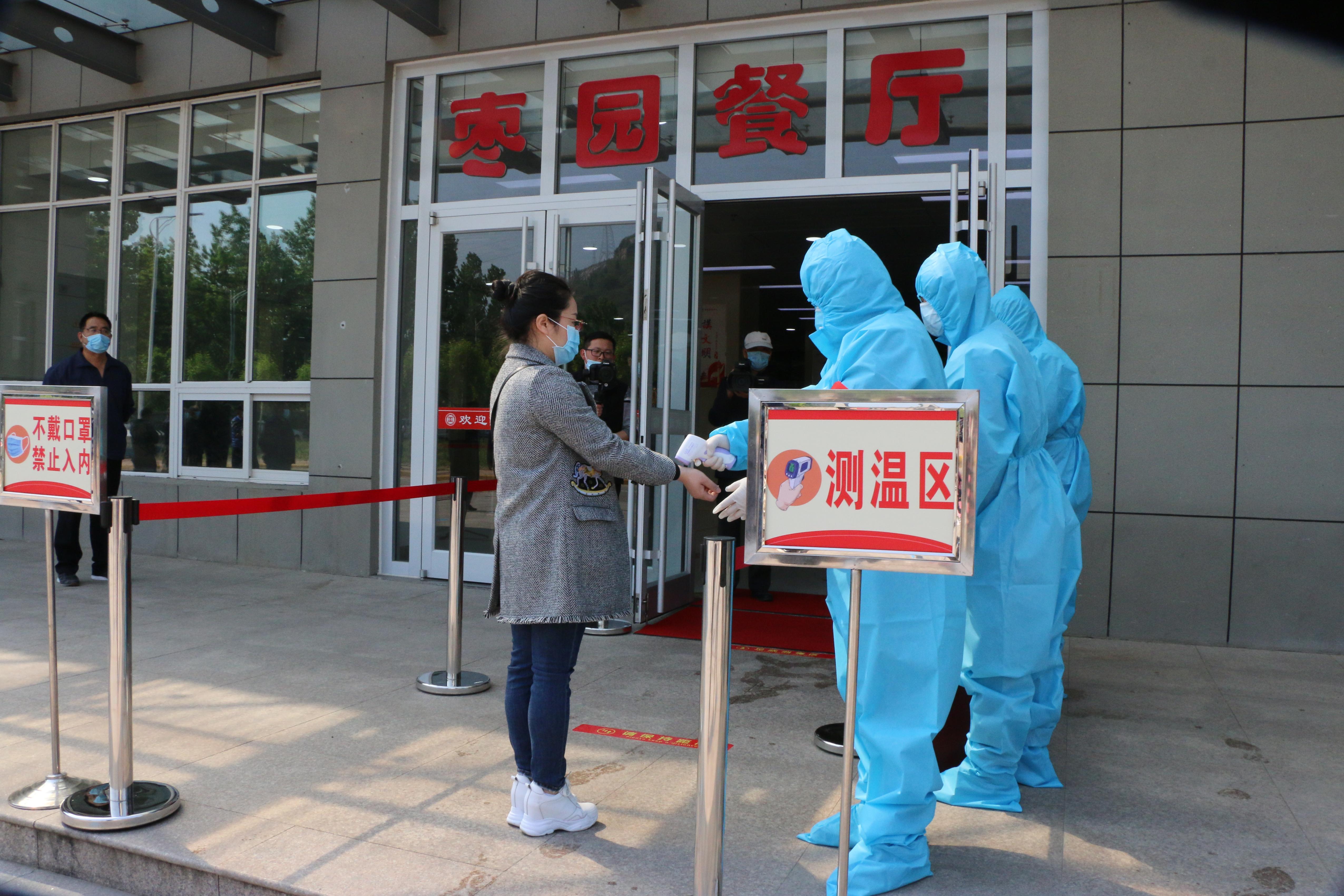 在“学生食堂错峰就餐应急演练”环节,三名体温监测员在门口分别负责测温、消毒工作,“学生”按照食堂门口“入口”指示进入食堂。在志愿者引导下,间隔两米有序排队打饭,“学生”取餐后单人单桌就餐。就餐完毕立刻按照食堂“出口”指示离开。志愿者现场监督提醒大家有序排队、少说话、不逗留。