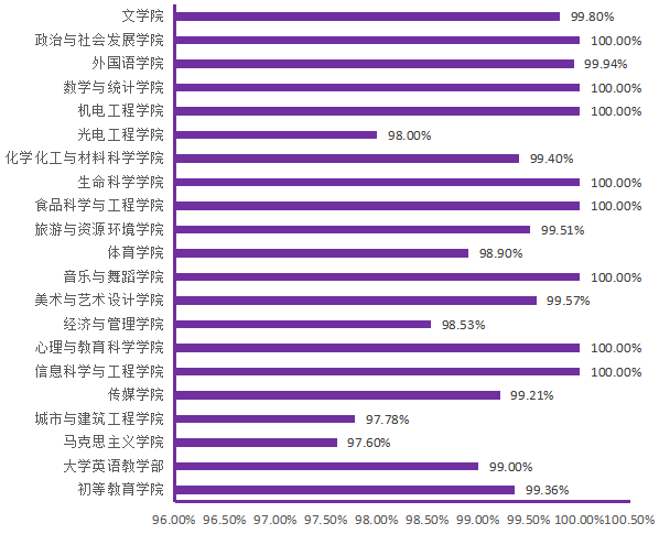 各院(部)的开课数、开课门次、班级数、教师数(人次)、学生数(人次)和学生上课率情况如下图所示: