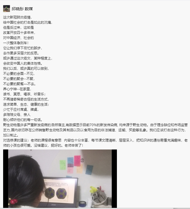 目前仍处于在新冠肺炎疫情防控的关键时期,但若想打赢这场战役,不能仅靠医护人员,全社会都重视起来,参与到自我预防中,防控的救治压力就小一点。生命科学学院王德亚老师发挥自身专业优势,面向全校学生开设了通识教育选修课《不死鸟病毒的秘密》,主要给学生讲授病毒学基本知识、致病机理以及防治措施等内容,有助于促进学生重新认识病毒和地球生命的关系,重新思考人类与地球和万物的关系。在前一阶段的学习中,学生初步理解新冠病毒的基本发病特征、命名原理等知识,对普及病毒病的基本知识和防控都有一定的意义。