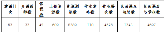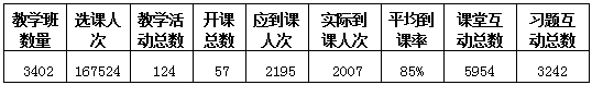 永利官网师生在雨课堂平台使用情况,根据大数据统计,由此查看本周教学班数量、教学活动总、开课总数、应到课人次、实际到课人次、课堂互动总数、平均到课率、习题互动总数,详情见下表: