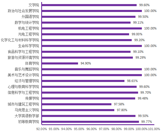各院(部)的开课数、开课门次、班级数、教师数(人次)、学生数(人次)和学生上课率情况如下图所示:
