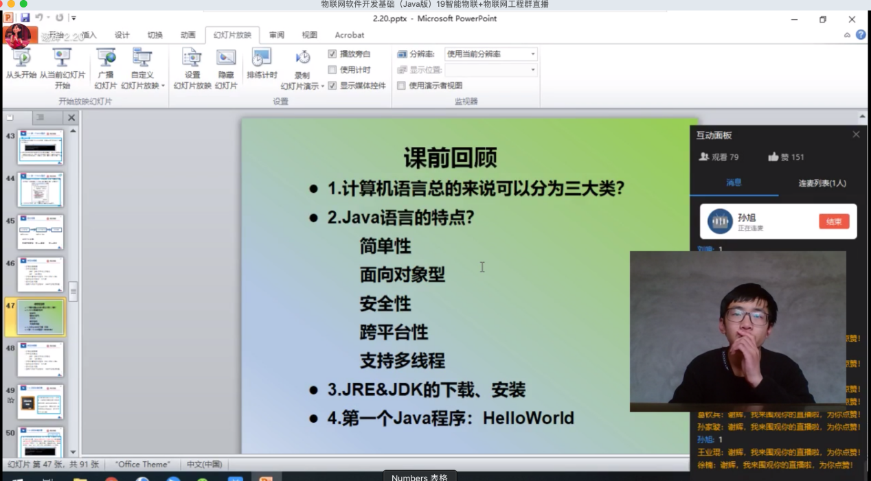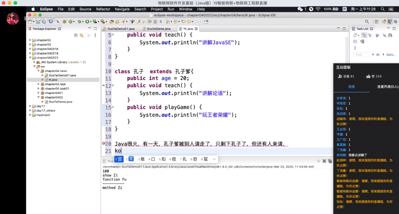 《物联网软件开发基础(Java版)》是目前2019级物联网工程和智能物联两个班级开设的课程。该课程是计算机类课程的核心课程,同时也是一门应用性较强的课程,并可以为学生参加各种软件类大赛提供基础编程知识。本课程的教学目标是培养学生初步分析和和解决问题的能力,同时为后继课程的学习以及软件开发打下良好的基础。为了使课程的知识要点等能够完整、有效地呈现给学生,让同学们对这节课感到充实而生动,信息科学与工程学院谢辉老师老师对线上教学中每个教学环节都精心准备,并抓好落实,具体做法如下: