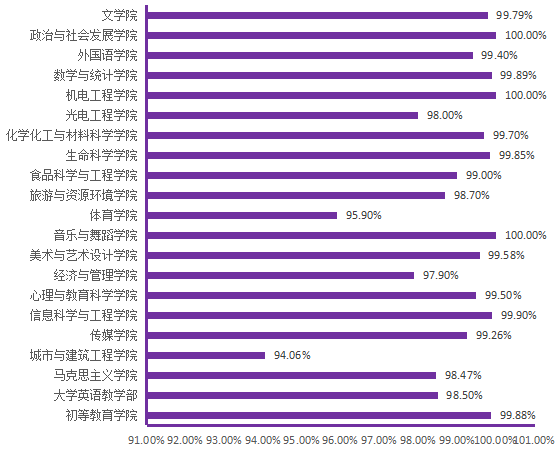 各院(部)的开课数、开课门次、班级数、教师数(人次)、学生数(人次)和学生上课率情况如下图所示: