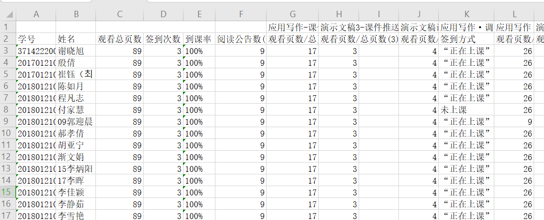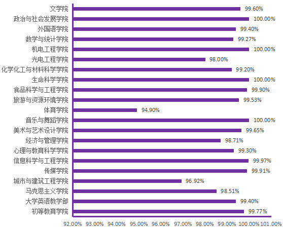 各院(部)的开课数、开课门次、班级数、教师数(人次)、学生数(人次)和学生上课率情况如下图所示: