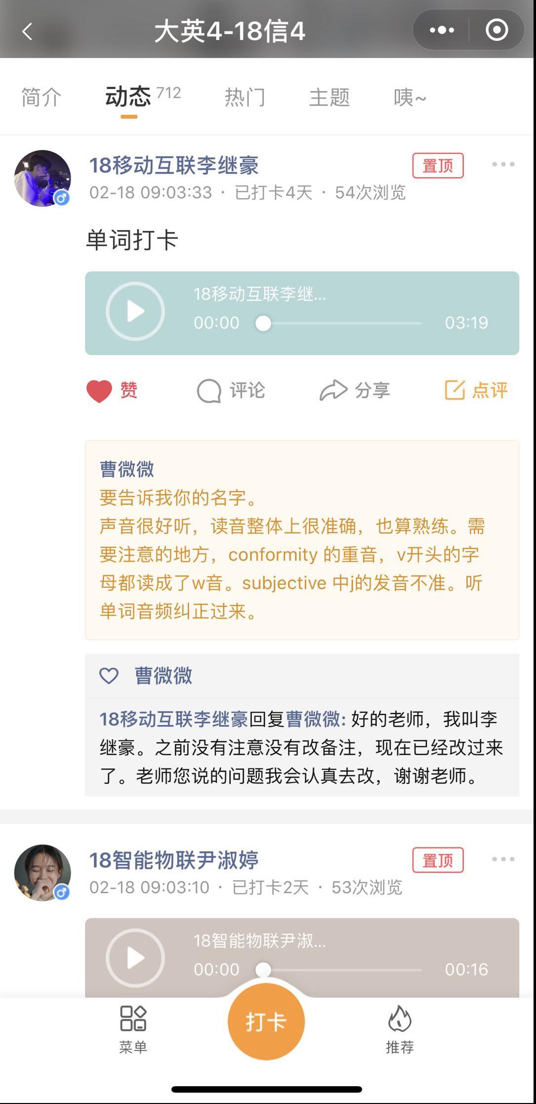 ---曹微微老师采用“录播+U校园+QQ群+微信小打卡”等方式开展在线教学