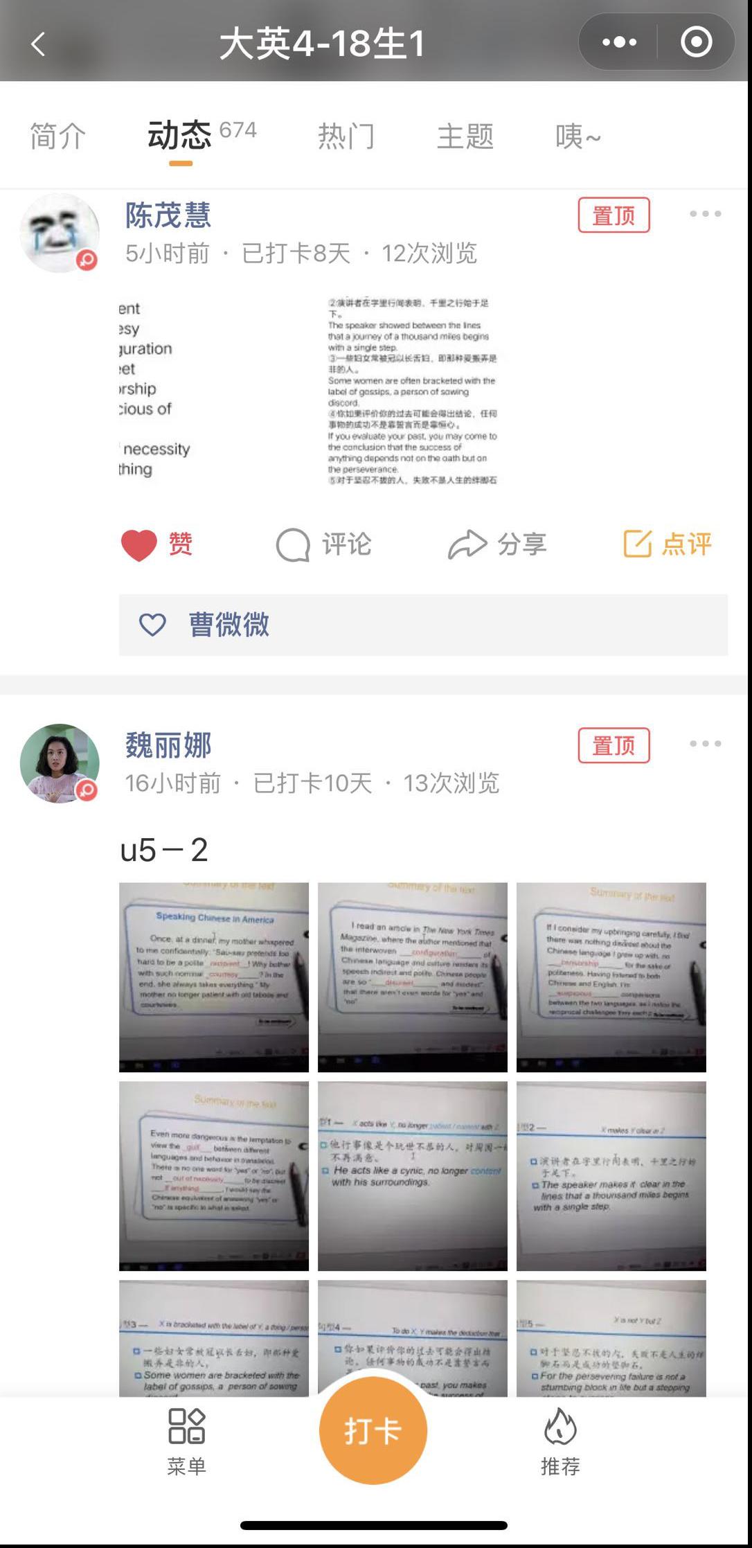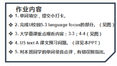 1.课后布置线上作业,作业提交到微信小打卡,图片、语音、视频等形式都可以。其中作文布置到句酷批改网。
