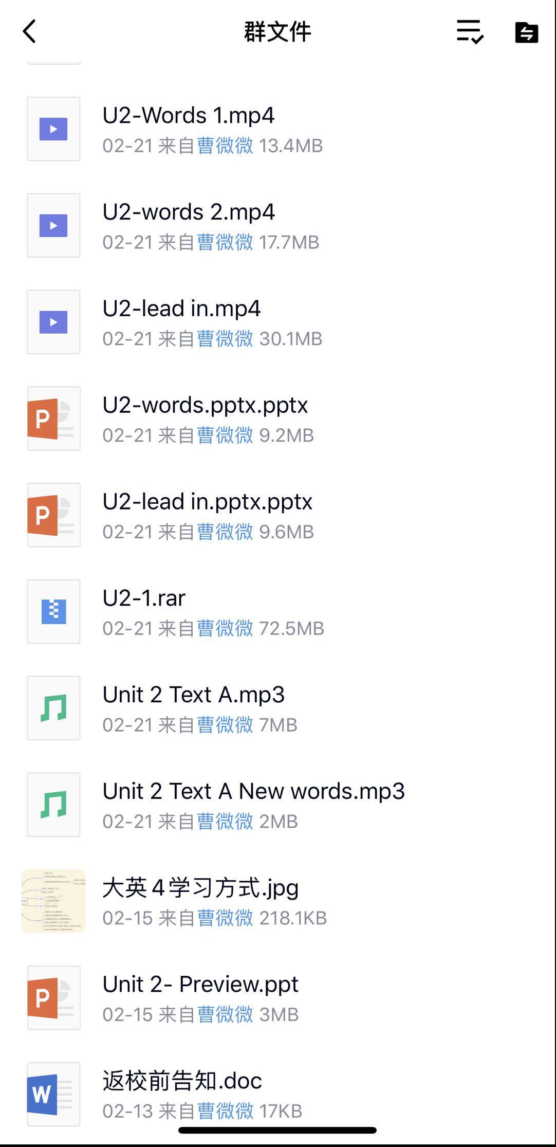 2.第一小节课,教师发布录制视频、课件和讲义到QQ群,让学生观看学习录制好的讲课视频。