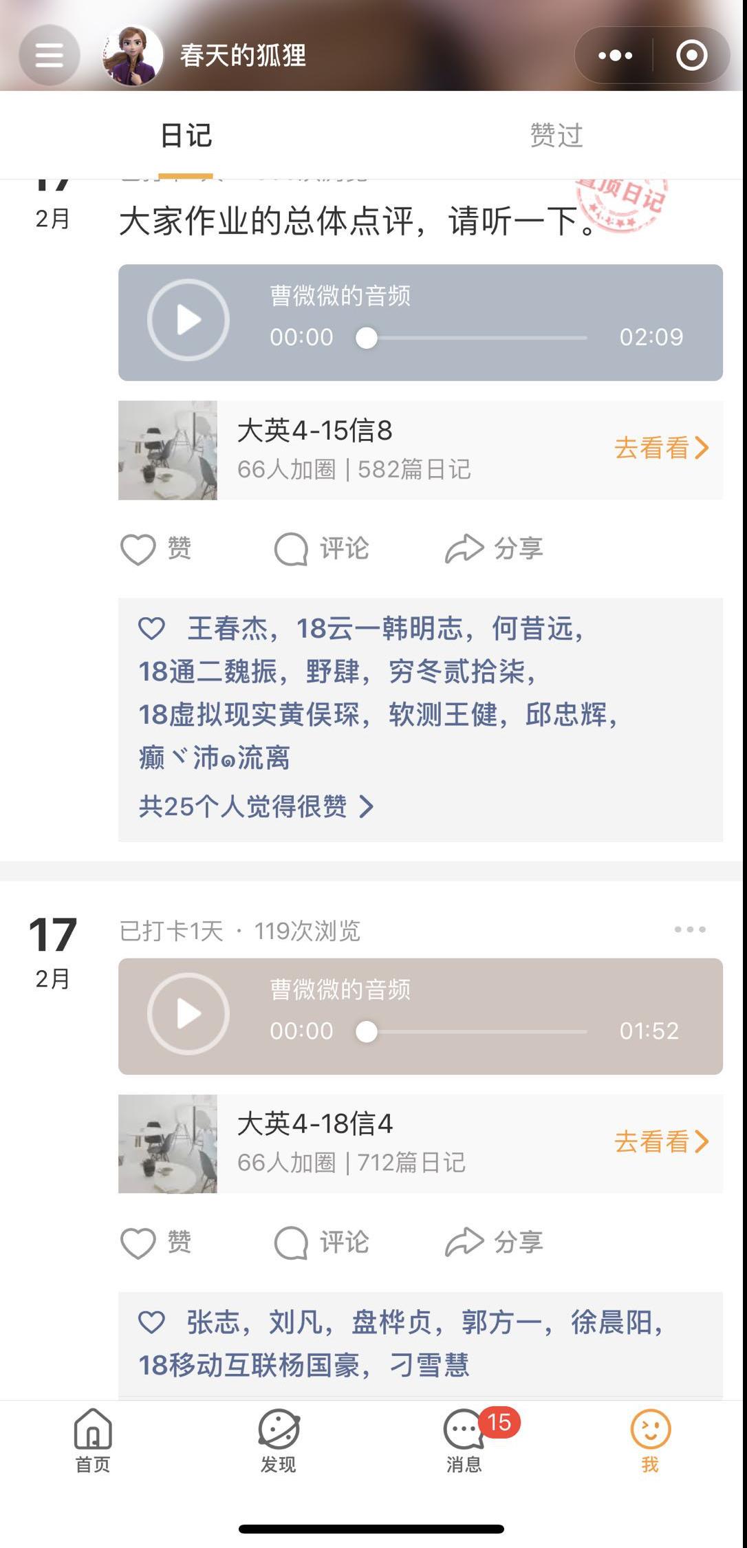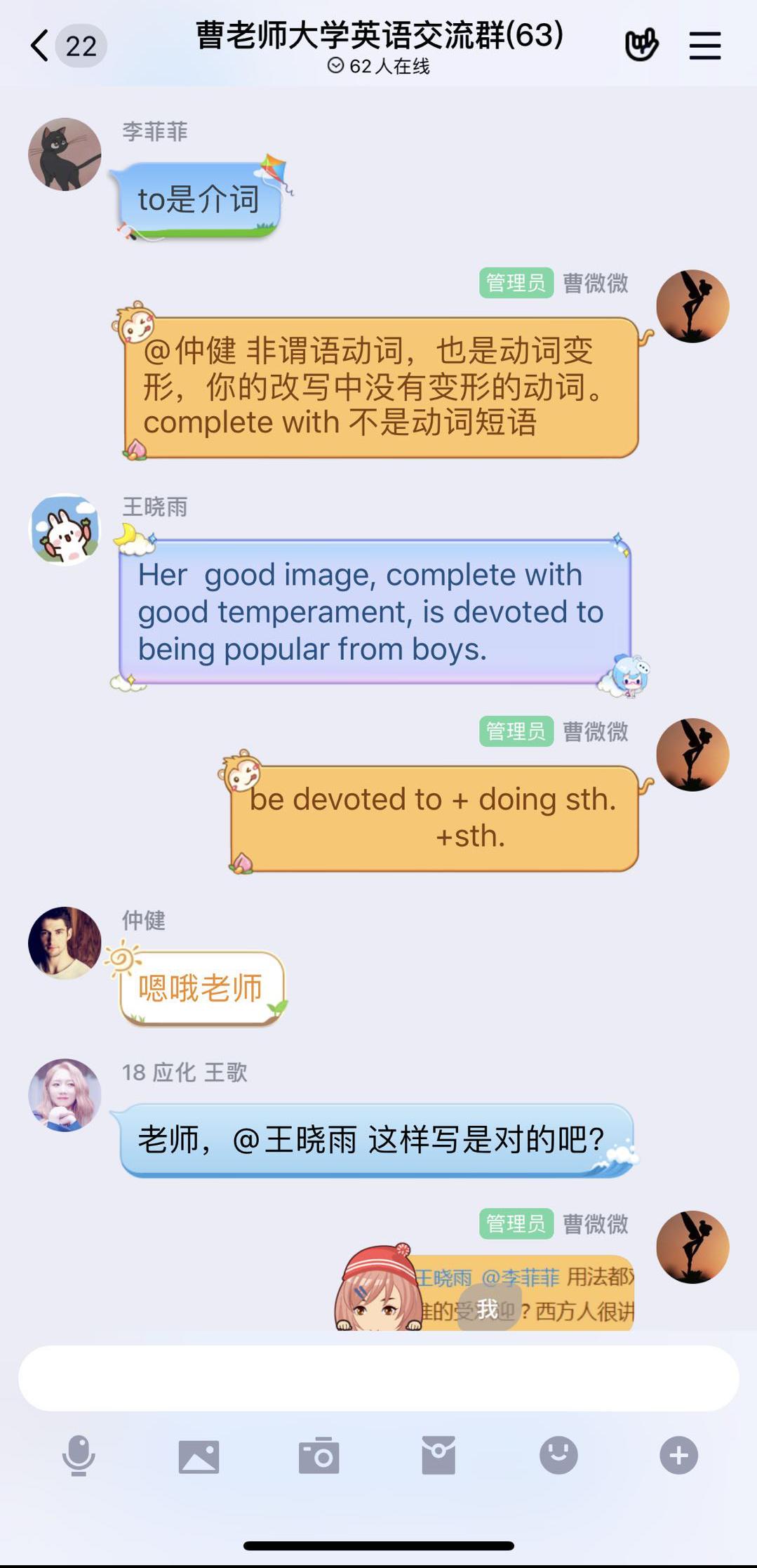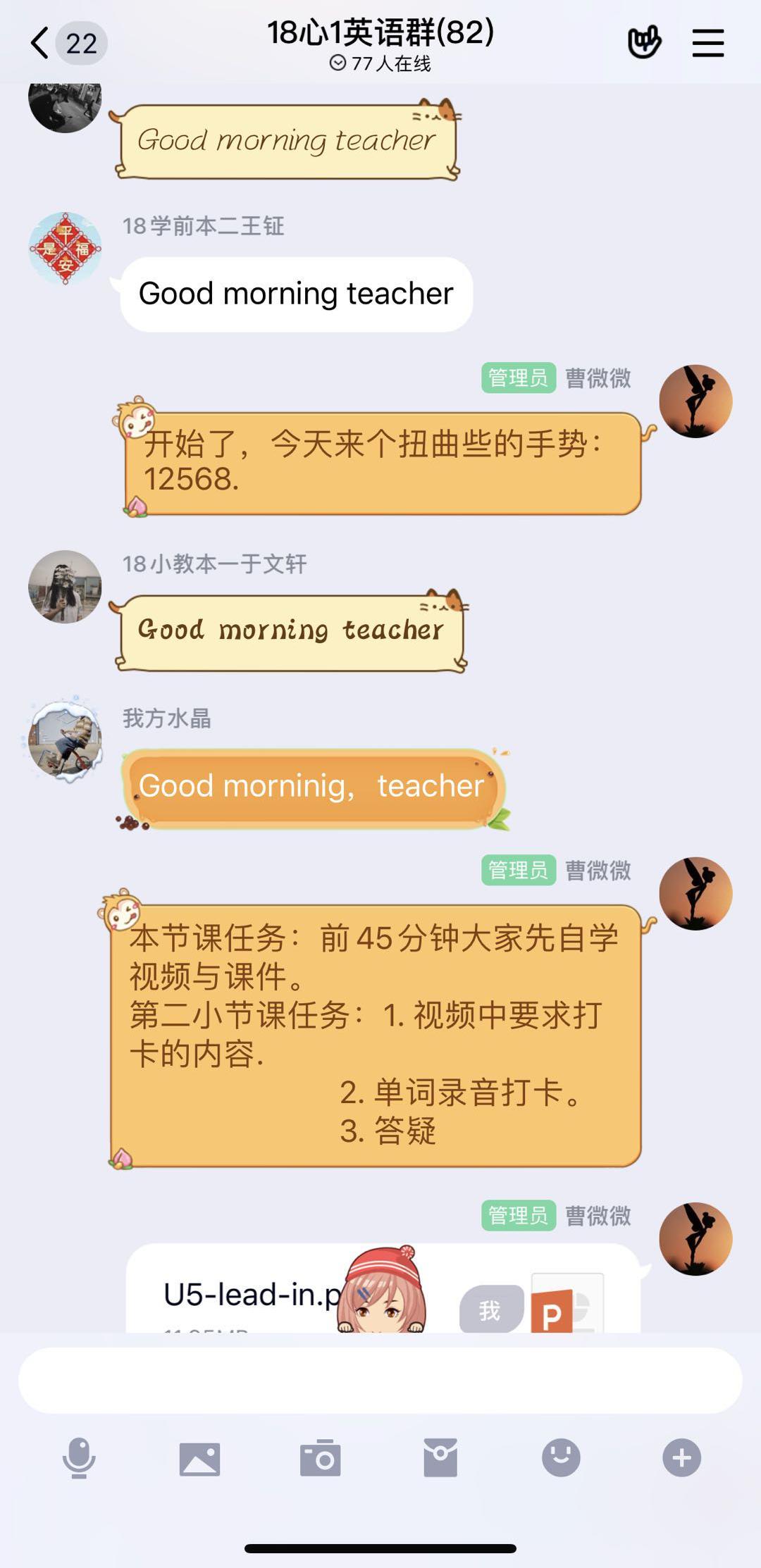 3.第二小节课,提交课堂作业到微信小打卡,并在QQ群里提问、讨论、答疑。教师发布的讲课视频里会有1-2个随堂作业,方便课上快速解答,提交到微信小打卡。之后,便是QQ群里讨论答疑,学生们对于使用文字或语音讨论很是积极踊跃,几乎不给老师回答的机会,质量也很高。