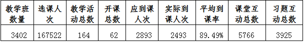 永利官网师生在雨课堂平台使用情况,根据大数据统计,由此查看本周教学班数量、教学活动总、开课总数、应到课人次、实际到课人次、课堂互动总数、平均到课率、习题互动总数,详情见下表:
