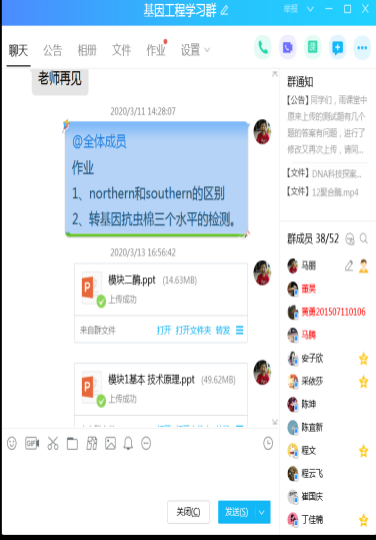 《基因工程》课程为生物技术专业的一门专业教育必修课程,也是生物工程领域的核心课程。为深入贯彻执行学校疫情防控期间“停课不停教、停课不停学”的号召,保障线上教学质量,生命科学学院马丽老师采取混合式的在线教学手段引导学生学习《基因工程》的相关基础知识,帮助学生构建基因工程操作的完整知识框架。她主要采用EVCapture软件录播课件做成讲课视频,以QQ课程学习群为平台,上课期间发布学习视频;同时借用雨课堂平台发布预习课件PPT和课后习题测试,根据学生预习和测验的实际情况,进行录制授课视频,做到有的放矢,以提高教学效果。其主要做法如下: