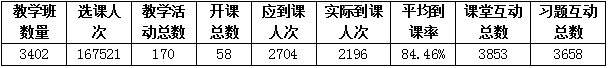 永利官网师生在雨课堂平台使用情况,根据大数据统计,由此查看本周教学班数量3402个、教学活动总数170、开课总数58门、应到课人次2704、实际到课人次2196、课堂互动总数3853、平均到课率84.46%、习题互动总数3658,详情见下表: