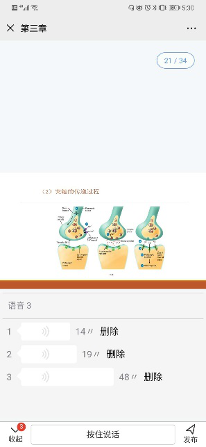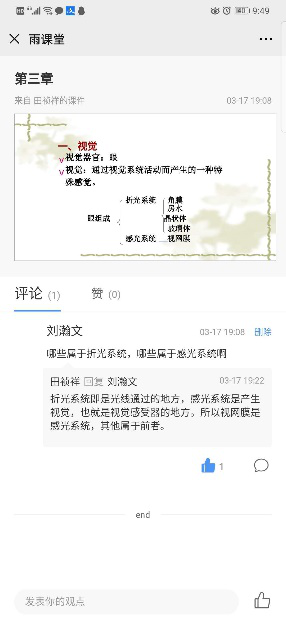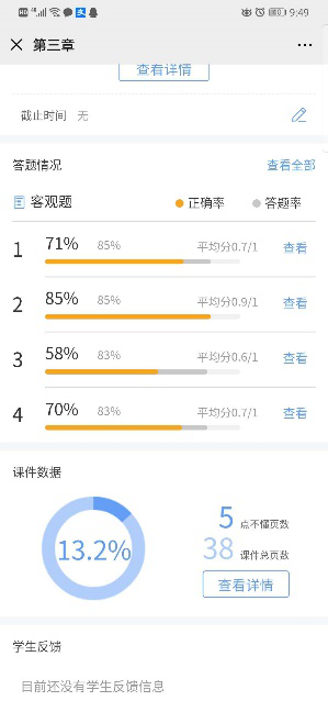 虽然《运动生理学》线上课程在体育类专业课中已经属于比较成熟的一门课,很多教学平台都有优秀的课程资源可以选择,但仍缺乏完全匹配教学内容和学时进度的资源,因此还需要根据教学计划进行课程教学,由于在线教学开展初期,很多平台出现网络高峰期的拥堵现象,直播开展困难,他选用了雨课堂的“PPT+语音”的模式,还原线下教学的老师授课,让学生在清晰观看PPT内容的同时也能听到老师的讲解。为了及时掌握学生学习效果和进度,设置了课件中的练习题,让学生检验自己的学习成效,也便于教师了解学生对知识点的掌握情况,为后面做重难点的讲解提供数据反馈。学生在观看课件时也可以对课件中的不懂环节进行标记和提问,以便老师追踪答疑。