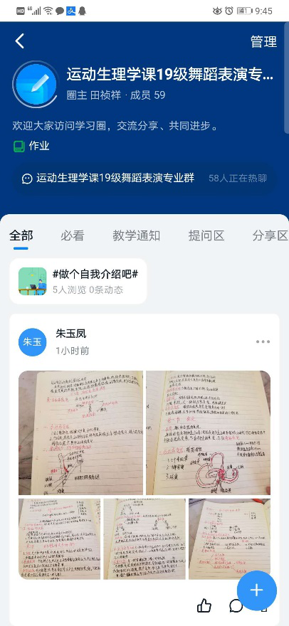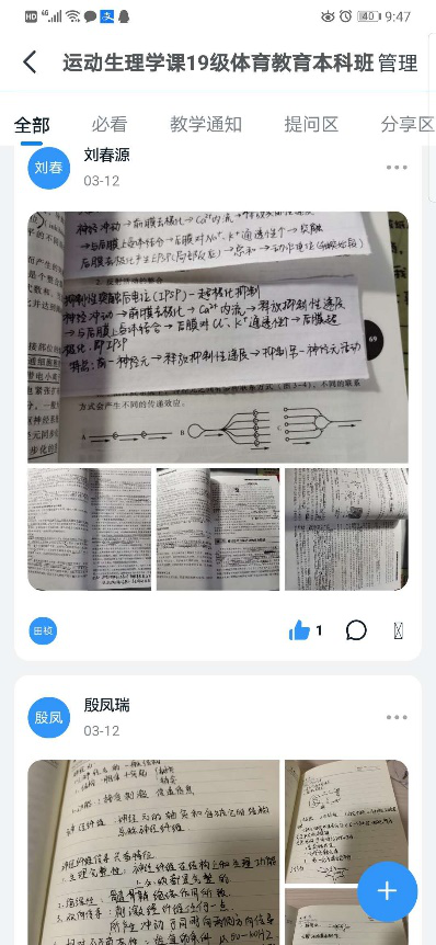 基于体育学院学生的特点,每节课后组织学生在钉钉学习圈内晒本节课笔记,营造充实的学习氛围,也便于学习交流。在分享中发现很多优秀笔记,也能反映出学生的学习态度,作为学习的激励机制。