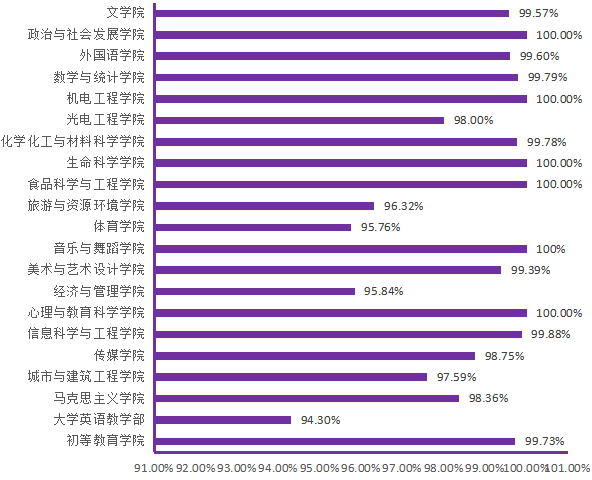 各院(部)的开课数、开课门次、班级数、教师数(人次)、学生数(人次)和学生上课率情况如下图所示: