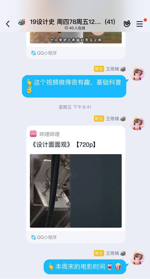 《工业设计史》课程面向大一学生开设,既是专业必修纯理论课,也是考研必考科目。根据课程的重要性及特点,王老师采取了双保险策略:一方面在山东大学王震亚教授的支持和帮助下运用中国大学MOOC平台开设了王教授主讲《设计史话》慕课的SPOC,并关联了微信小程序[慕课堂],让学生在每周的直播课前完成自主学习。同时,王老师学习借鉴了江苏师范大学美术与设计学院陈芳老师的教学经验,并针对本学期的《工业设计史》课程重新设计了线上教学环节。每周线上直播课程依旧选用QQ群分享屏幕+视频直播的方式(见图2),用20分钟左右时间和学生们共同回顾MOOC里发布的自学课程内容,帮助学生梳理重点,讲解作业。课程后续时间,王老师会依据选用教材所准备的课件,结合MOOC视频做辅助补充。