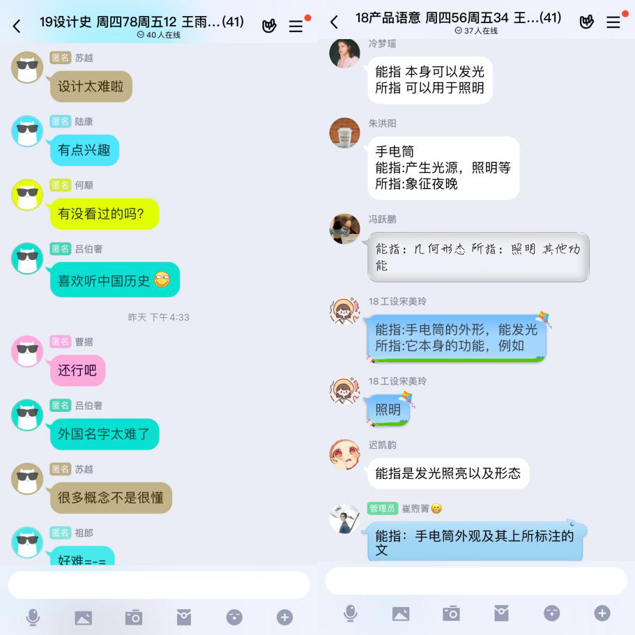 《设计符号与产品语义》课程总课时32学时,包括理论16学时、实验16学时。王老师在学期初已在群内下达实验计划及任务,现已完成两轮观察实验,处于数据分析阶段。自第三周开始进入理论课时教学,采用QQ群内屏幕分享+视频直播的方式讲解(见图1)。这种教学方式一方面可以让学生直接看到老师,不会因线上听课而产生距离感;另一方面视频直播的方式更有利于讲解一些较晦涩的符号,而且学理论时可以使用事前准备好的教具边演示边讲解,通过学生的反馈也了解到这种教学效果较好,学生比较认可。