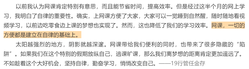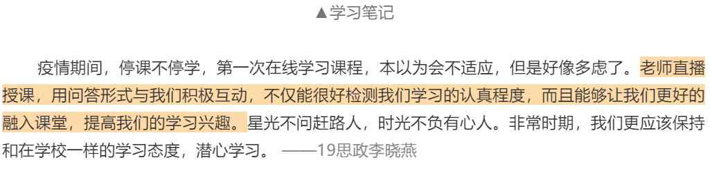 虽然疫情导致线下面对面教学受限,但教师们都以最大的热情投入到线上教学,别样的在线课堂不仅极大调动了教师教学改革创新的积极性,也增强了教师教学的使命感和责任感。学校每天通报在线教学开展情况,分享典型案例和典型做法,建立信息分享机制,不仅可以积极营造在线教学的良好氛围,也有助于不断提升疫情防控期间的在线教学质量。