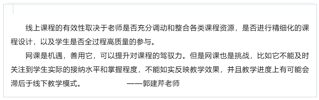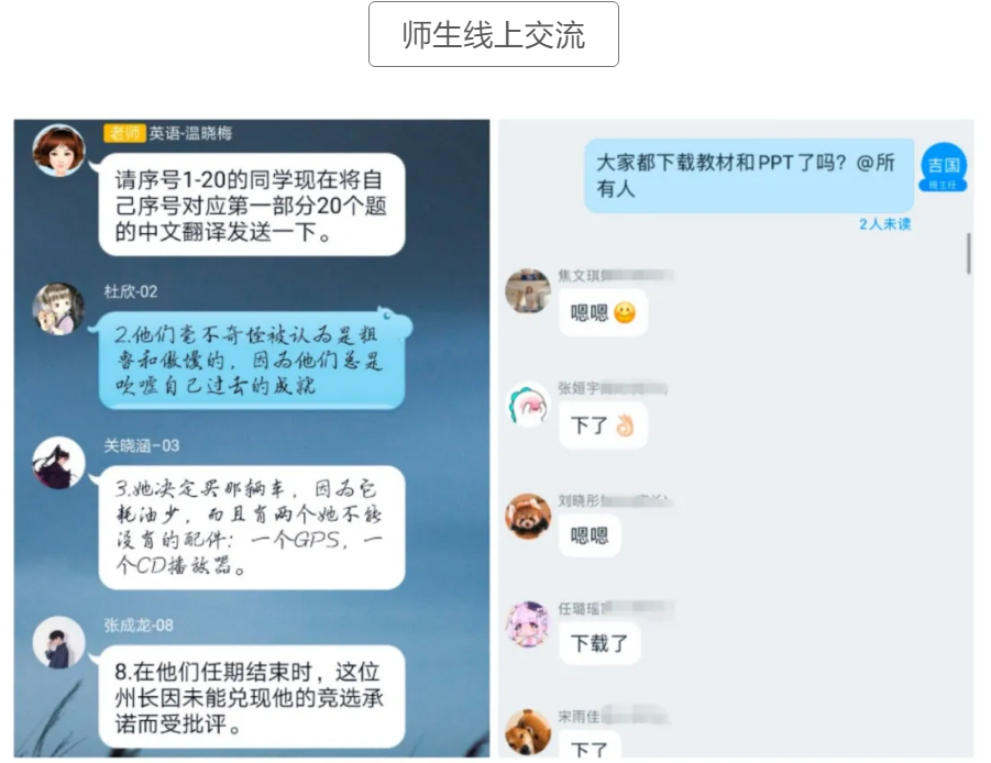 尽管初次接触线上教学,需要克服的困难很多,需要适应的地方也很多,如地点不同、方法有异,还有许多客观因素导致的网络通讯中断等意外事件的发生。但是,老师们仍认真备课,并想方设法缩小线上教学与线下教学的教学效果差异。