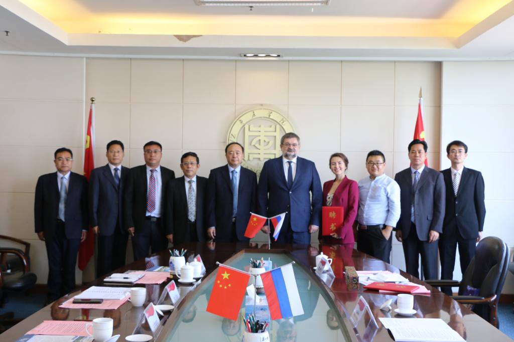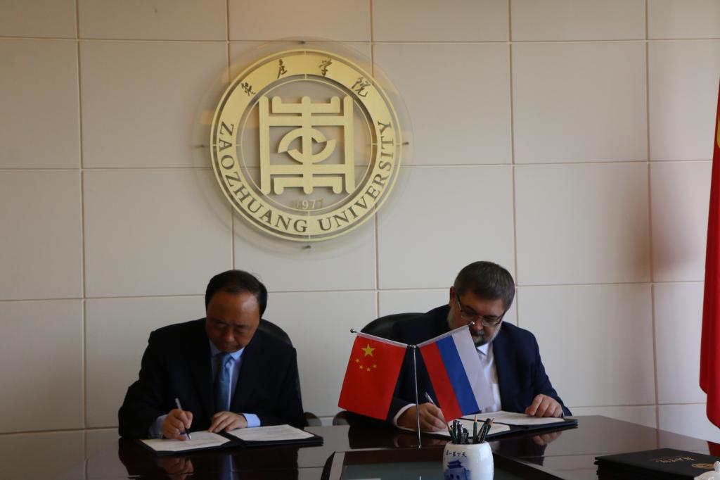 曹胜强代表永利官网与塔拉卡诺夫校长签署合作交流协议,并颁发了特聘教授聘书。