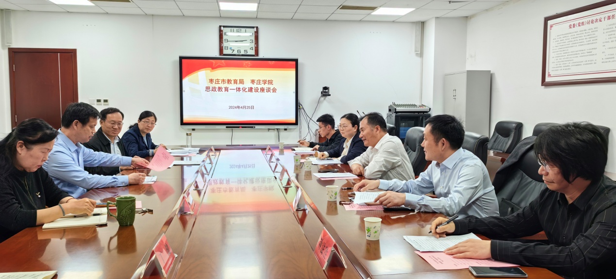 为深入推进枣庄市大中小学思政课一体化协同创新发展,4月26日,教务处处长张立华、马克思主义学院党政人员等一行5人赴枣庄市教育局就大中小学思政课一体化建设工作进行洽谈交流。市教育局党组书记、局长王光明等参加座谈会。座谈会由市教育局党组成员、副局长朱卫主持。
