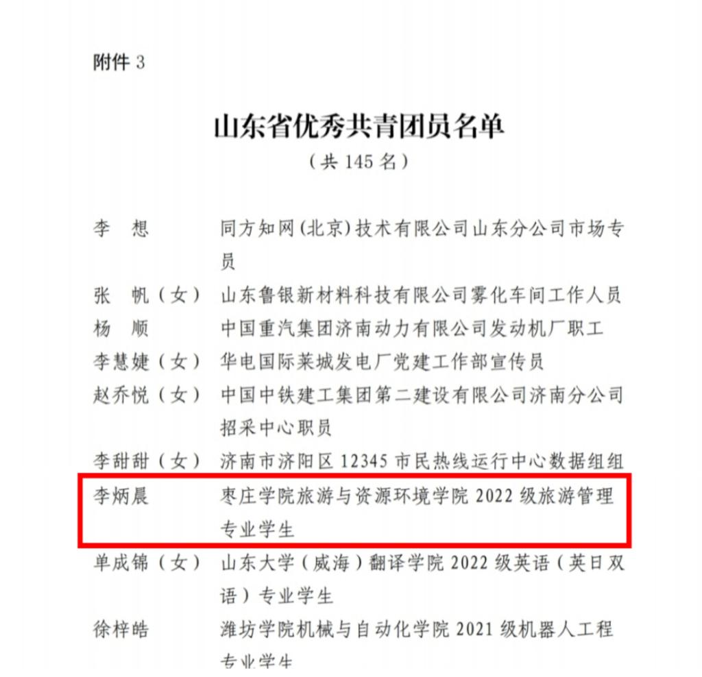 近日,共青团山东省委公布《关于表彰2023-2024年度“山东青年五四先进集体“山东青年五四先进个人”的决定》,永利官网旅游与资源环境学院2022级旅游管理专业学生李炳晨荣获“山东省优秀共青团员”荣誉称号。