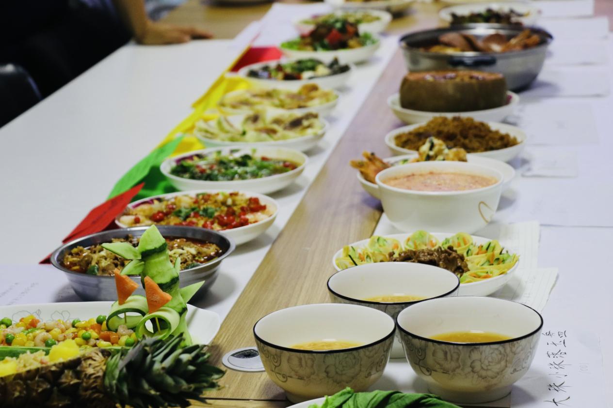 本次大赛以宿舍为单位组队参赛,共有30多支队伍参加了这场精彩纷呈的厨艺比拼。选手们个个精神饱满,煎、炒、蒸、焖样样精通,荤素搭配,健康美味。馅料饱满、外酥里嫩的“韭蛋香韵煎包”把对生活的期许和对美食的执著融合在一起,每一个都承载着满满的爱的味道;圆润的虾球、酥脆的外壳,“芥末虾球”以圆为形,寓意圆满,以明媚的黄色作为基调,充满活力和希望;“一帆风顺”别出新意,在黄瓜里放入什锦和虾仁,并雕刻成帆船的形状,寓意支教工作一切顺利;粒粒分明的米饭搭配多种食材,菠萝独特的迷人香气锦上添花,回味余韵绵长……看似普通的食材,在选手们的慧心和巧手下蜕变成一道道既养眼又养胃的美味佳肴,呈现出视觉与味蕾的盛宴。
