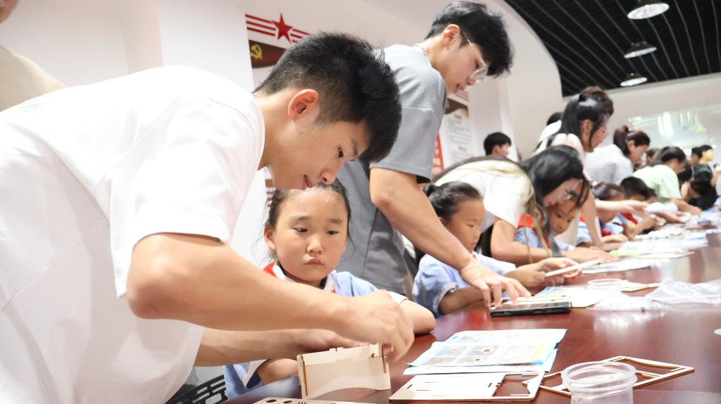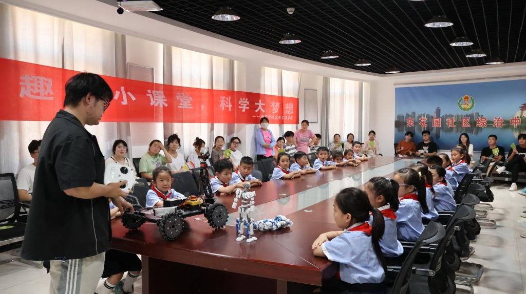 趣味科学小课堂,追逐少年大梦想。在东花园小区,志愿者为来自市中区中兴小学的20名小朋友上了一节充满乐趣的科学实践课,课上展示了学院2024年睿抗机器人开发者大赛省赛一等奖作品“睿苗智能侠”,让小朋友亲身体验遥控自制机器人的乐趣与奥妙;采用一对一的模式指导小朋友完成风力发电机、盐水发电机、七彩小夜灯、四驱小赛车等作品,用“童言童语”为小朋友们讲解物理知识,让小朋友们在动手中拓宽科学视野,在实验中悟出科学真理。