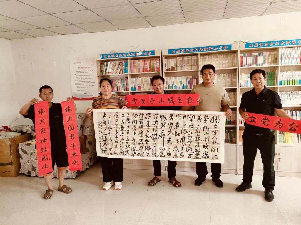 书写完成后,陈超带领村两委、党员将作品进行了张贴和赠送,进一步营造了下龙庄村喜迎“七一”的良好氛围。