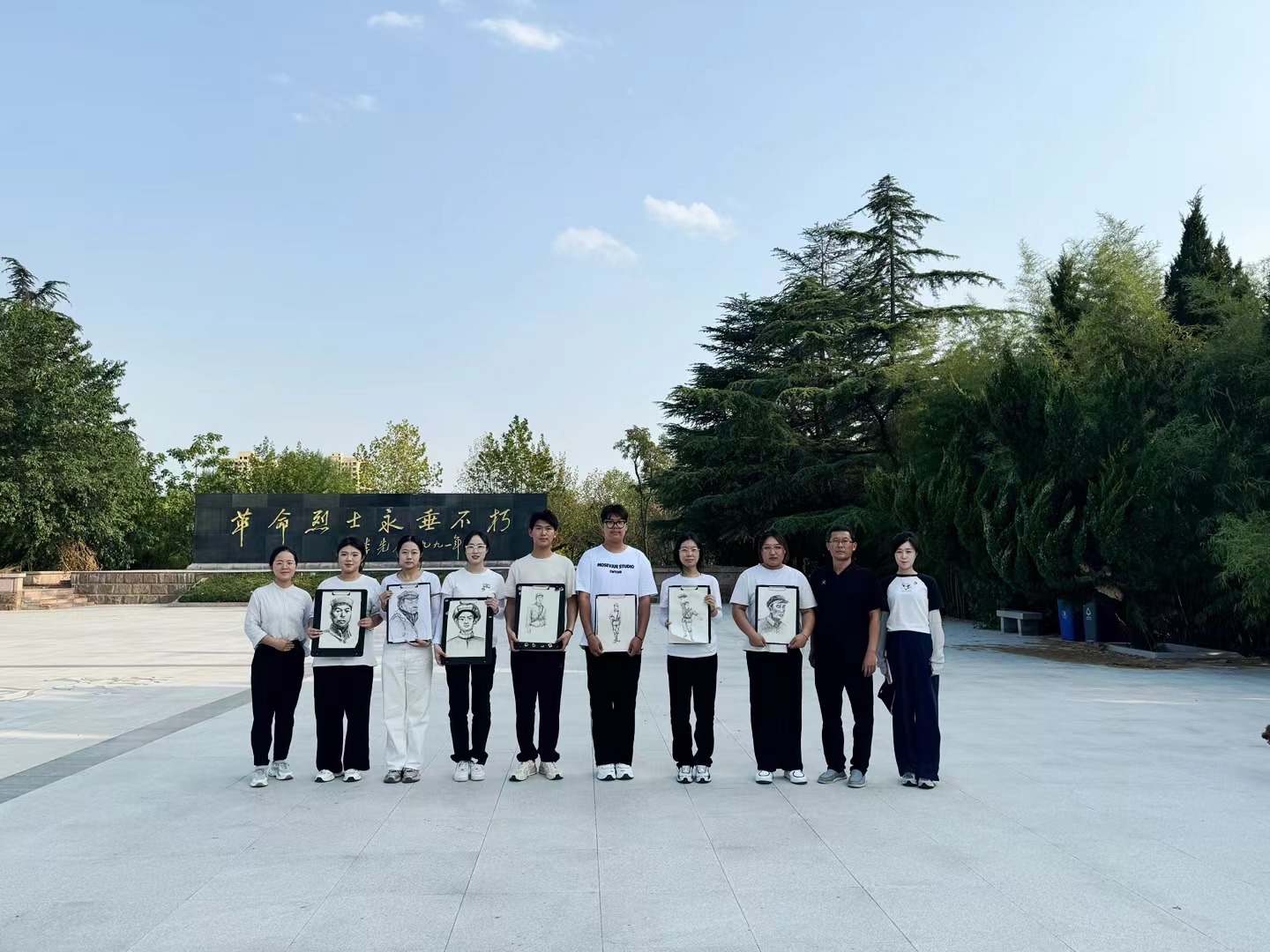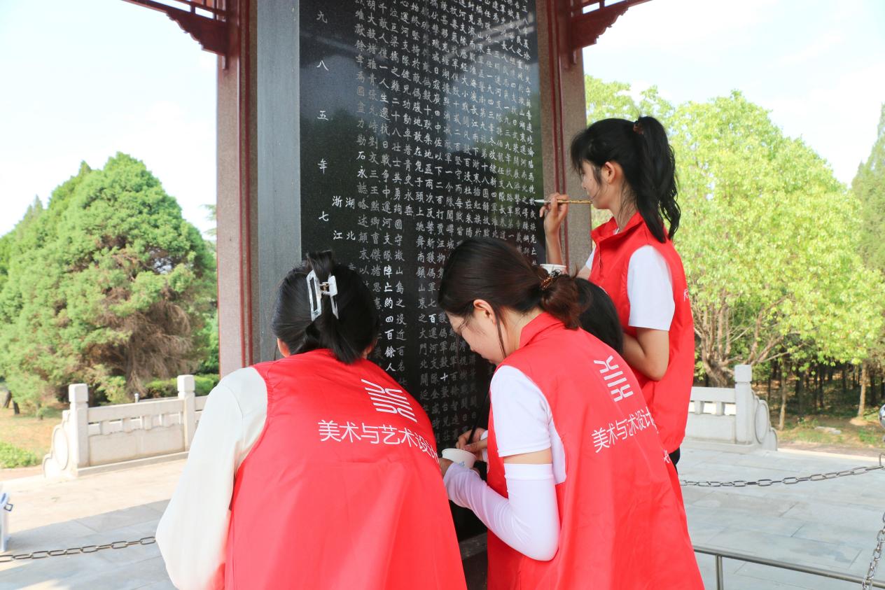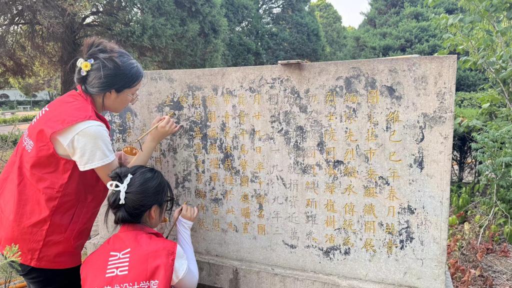 在怀烈亭中,烈士陵园王主任讲述了“青年战斗英雄”安保全的故事,党员们深入了解到他的英雄事迹,并清扫了亭中的落叶、杂草、树枝等。在手绘英模环节,美术学专业党员志愿者发挥专业优势,用手中的画笔还原烈士的样貌,再现安保全、马立训等英雄故事,传承红色基因。书法学专业党员志愿者开展碑文修复志愿服务活动,擦去纪念碑上的灰尘,用毛笔蘸金箔漆,一笔一画为枣庄革命烈士陵园碑文进行描金,纪念碑上逐渐暗淡的文字再次熠熠生辉。本次活动共绘制14件作品并赠与枣庄革命烈士陵园,完成三处碑文修复。