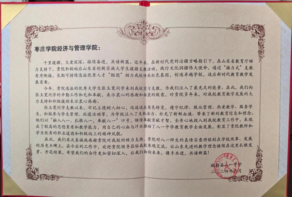 千里援疆,大爱深深。近日,经济与管理学院收到一封来自新疆维吾尔自治区喀什市疏勒县八一中学的感谢信。信中对学校和学院选派优秀大学生援疆支教表示感谢,对经济与管理学院支教学生张玉宽的辛勤工作和无私奉献给予充分肯定和赞赏。