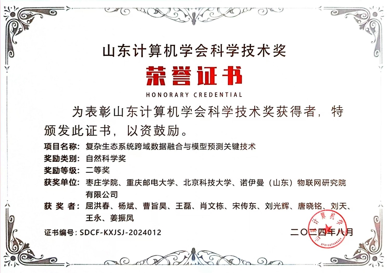 近日,山东计算机学会2024年度科学技术奖评审结果公示,永利官网信息科学与工程学院(人工智能学院)屈洪春教授团队牵头完成的“复杂生态系统跨域数据融合与模型预测关键技术”荣获得自然科学奖二等奖。