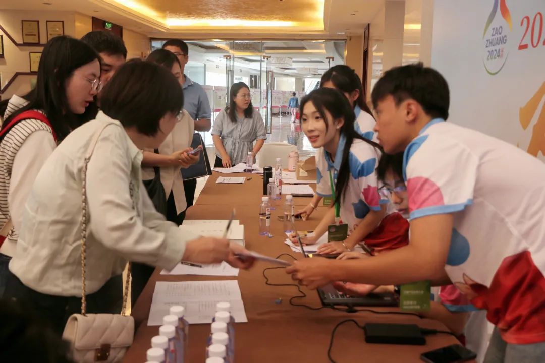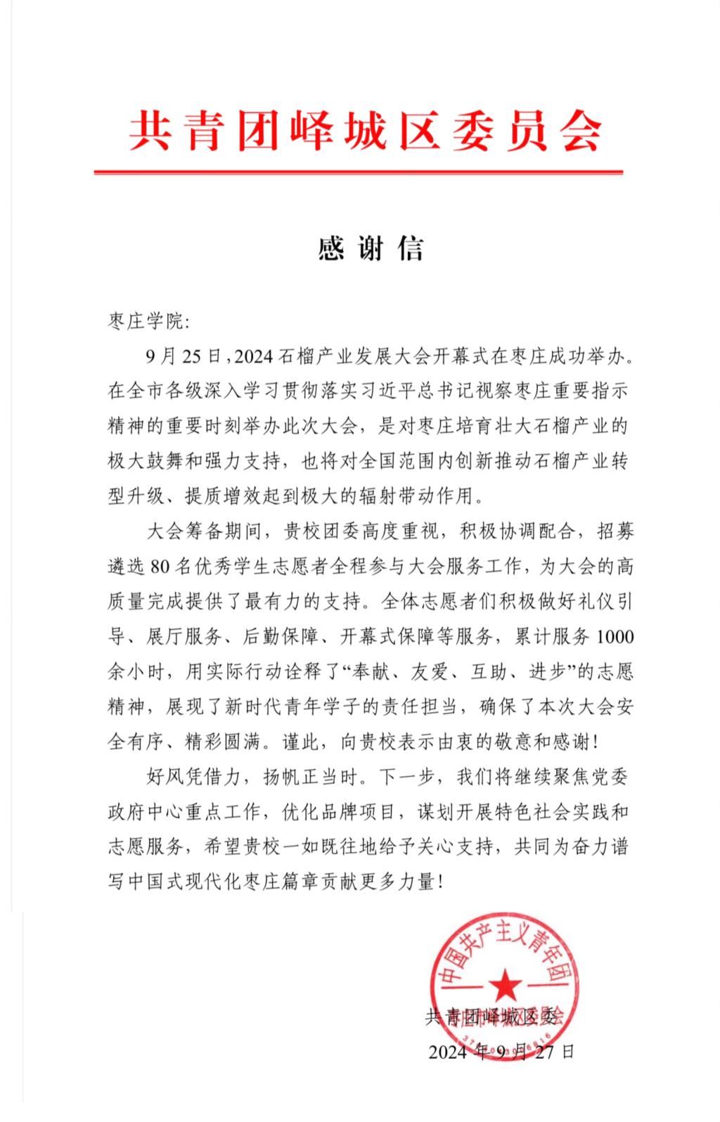 9月25日,由枣庄市人民政府主办、峄城区人民政府承办的“‘榴’助产业振兴 ‘枣’享红火生活”2024石榴产业发展大会成功举办。永利官网80余名青年志愿者在礼仪服务、场地引导、物品分发等各个岗位上,以专业的服务技能、热情的服务态度出色完成了本次志愿服务活动,成为了大会上一道靓丽的风景线。