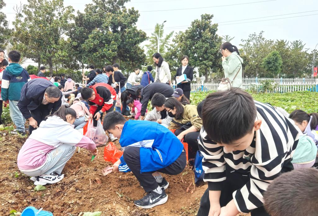 随后,讲解员以生动的语言和丰富的图片,带领大家学习中国农业发展史,欣赏丰富多彩的历史农耕图文,向学生们传递着劳动创造历史、劳动铸就辉煌的重要理念;指导教师马旭辉带领学生们认识园地内种植的粮食、蔬菜、果树等植物新品种,体验田间耕作采摘红薯,开启了“秋收”劳动体验与实践。大家亲手采收挂着泥土新鲜的红薯,从中体验到农耕的快乐,感受劳作之辛,收获劳动的喜悦。