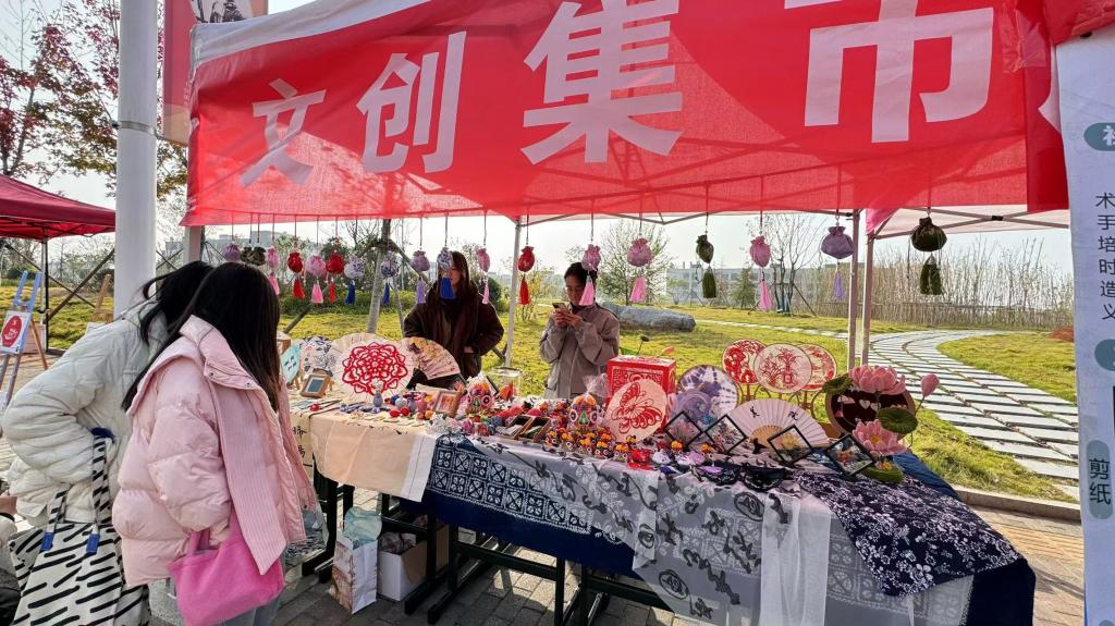 活动现场热闹非凡,各类文创产品琳琅满目,汇聚了来自三个社团共计200件文创产品。展示的文创产品均来自民间手工艺协会、大地书画协会和文萃印社全体社团,包括立体纸艺、非遗剪纸、非遗漆扇、书法卷轴、布艺、陶艺首饰、植物书法文创、拓印、竹编画、水彩画、国画等近20类文创作品,提供了非遗糖画、非遗剪纸、书法文创、非遗扎染四个手工体验区域。体验区域深受同学们喜爱,糖画绘制和美味交融、巧手变红纸为美丽的窗花、地上的落叶变植物书签,热闹活泼的社团活动,为校园增添了一抹艺术的色彩。