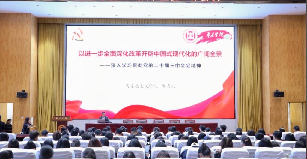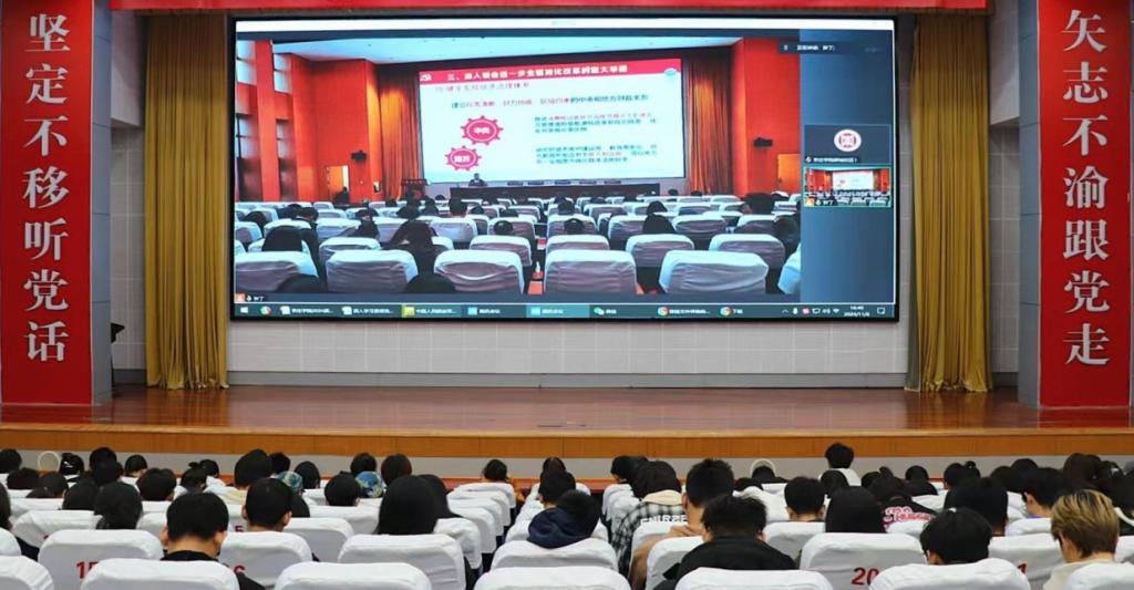 邢西敬以“以进一步全面深化改革开辟中国式现代化的广阔全景——深入学习贯彻党的二十届三中全会精神”为主题,从“深入领会党的二十届三中全会的重大意义”“深入领会党的二十届三中全会精神”“深入领会进一步全面深化改革的重大举措”“践行中国式现代化征程中青年的使命担当”四个方面向同学们作了详细讲解。报告强调,在新的时代背景下,青年学子应当矢志不渝地以党的最新理论成果武装头脑,全面把握党的二十届三中全会精神实质,深刻体会新时代党的创新理论体系的科学性与真理性,不断增强“理论自信”,积极践行党的群众路线,紧密联系群众,扎根人民,为推进党的理论创新与实践创新融合统一,展现枣院青年的蓬勃朝气与昂扬锐气。