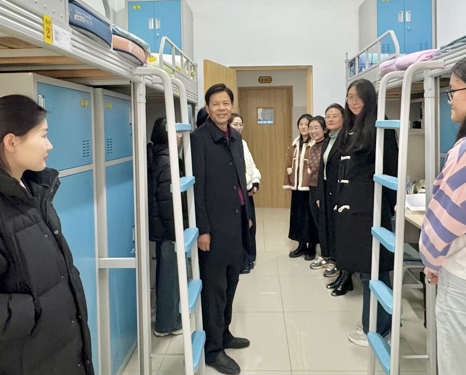 走访宿舍,温暖相随。宋明峰亲切询问了学生们近期的学习和生活状况以及他们对未来的规划,鼓励学生树立远大理想,精心规划学业,珍惜宝贵时光,不断努力提升个人能力。同时提醒学生们注意保暖,保持室内空气流通,预防疾病传播,希望同学们相互帮助,和谐相处。