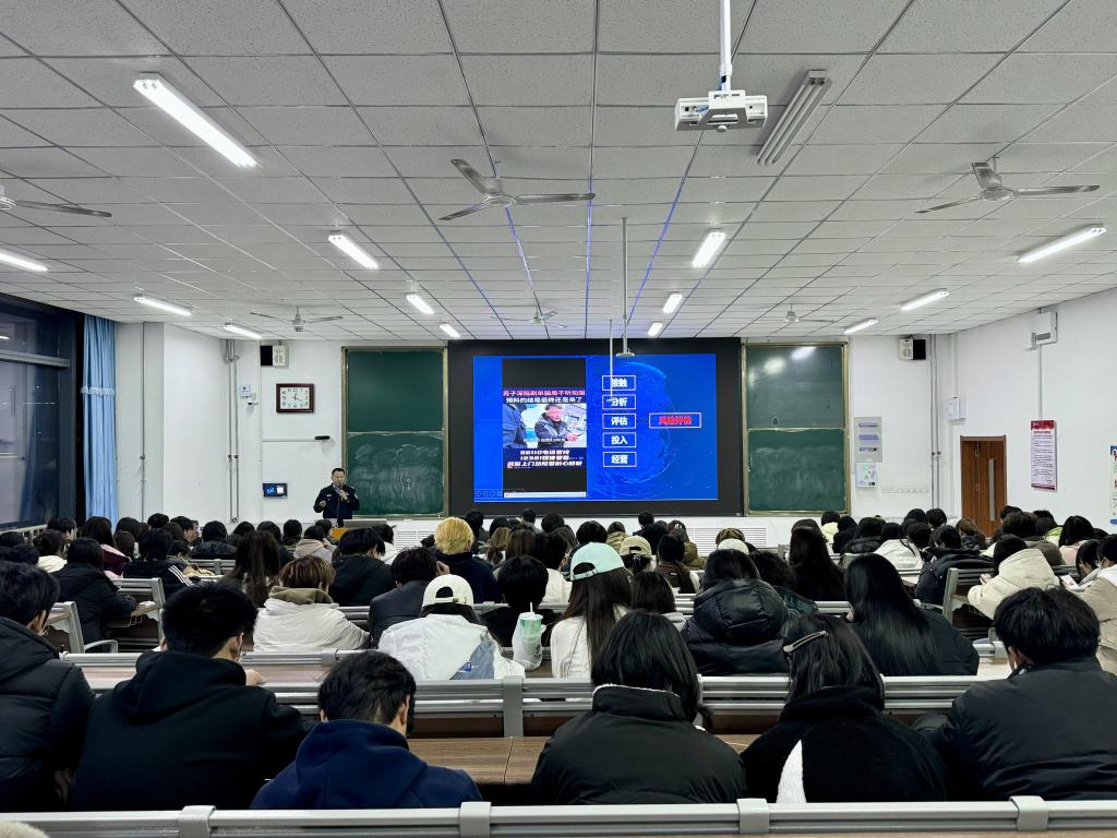活动现场,刘守文通过财商思维与防骗识骗思维、什么是电信网络诈骗、常见电信网络诈骗类型三方面讲解了当下网络电信诈骗案件。他结合近期高发的诈骗案例,以及周围的真实案例,用通俗易懂的语言向同学们深入浅出地讲解了诈骗分子的作案手法和特点。通过真实案例向同学们详细介绍了电信诈骗的常见类型,如网络贷款诈骗、刷单返利诈骗、“杀猪盘”诈骗等。提醒同学们时刻保持警惕,切勿轻信陌生人的来电和信息,并指导同学们下载安装“国家反诈中心”APP,开启来电预警功能。互动问答环节,同学们积极提出了自己在日常生活中遇到的疑问,刘守文耐心解答,现场气氛活跃。