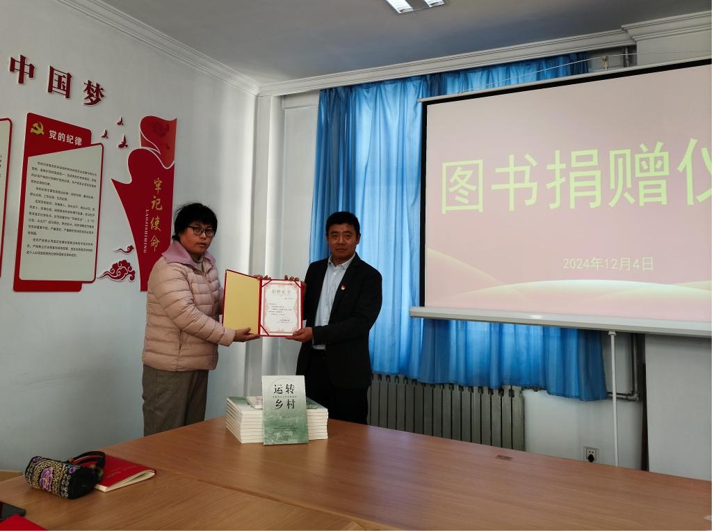 党课结束后,进行了图书捐赠仪式。邢西敬博士把自己的专著《运转乡村》捐给校图书馆20册,彰显了他对知识共享的担当和对学校图书馆建设的支持。