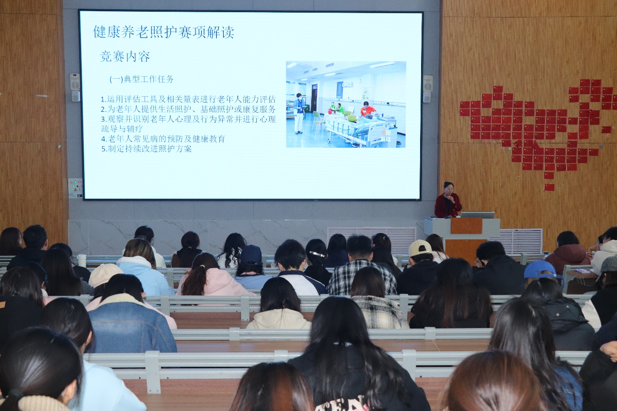交流会后,健康管理学院在增信楼113召开健康照护赛项和备赛策略经验交流会,2023和2024级智慧健康养老服务与管理专业全体学生参加。枣庄科技职业学院刘新华老师从竞赛目标、评分标准等方面深度解析了健康照护赛项和备赛策略。枣庄科技职业学院获奖学生付雅梅同学现场演示了健康养老照护操作流程,展现了健康养老照护知识和技能,赢得参会师生一致好评。