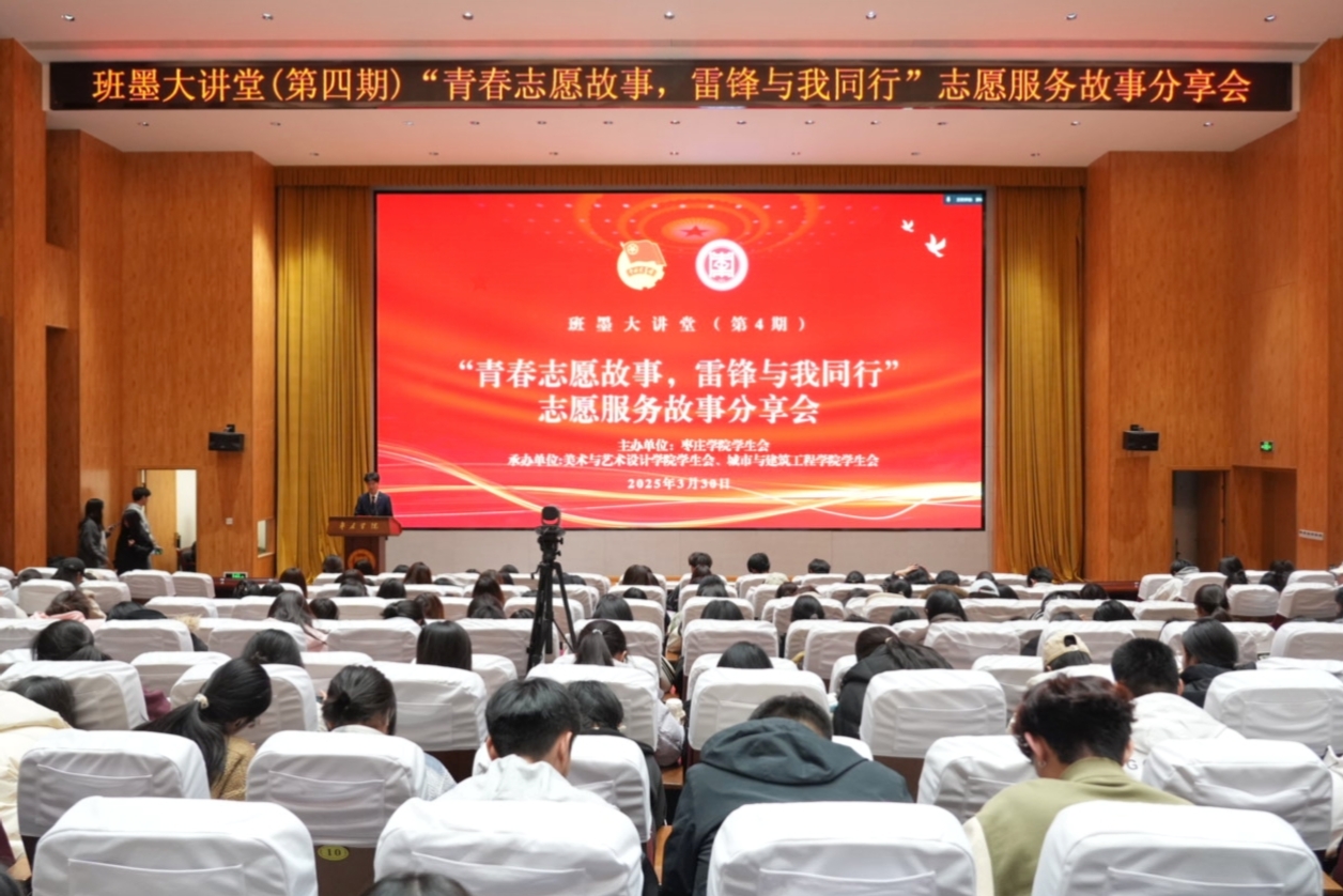 为弘扬雷锋精神,传递志愿力量,3月30日,永利官网在薛城校区崇德楼报告厅、市中校区综合楼报告厅同步举办第四期“班墨大讲堂”——“青春志愿故事,雷锋与我同行”志愿服务故事分享会。本次活动由校团委主办,美术与艺术设计学院和城市与建筑工程学院联合承办,各学院共计600余名学生代表参加。