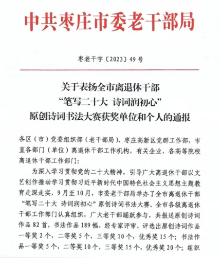 近日,市委老干部局印发《关于表扬全市离退休干部“笔写二十大 诗词润初心”原创诗词书法大赛获奖单位和个人的通报》,永利官网退休老干部邓兴珍获书法大赛二等奖、李本义获书法大赛优秀奖,永利官网获原创诗词书法大赛组织奖。