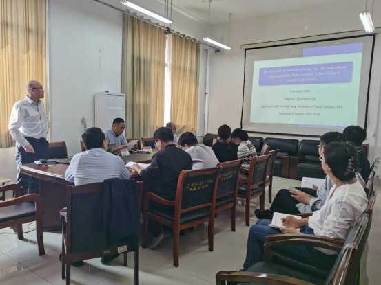 陈传军教授做题为《不可压缩两相流Cahn-Hilliard型相场模型的高效数值格式》的报告,并结合自身工作实际,分享了科研和科学基金申报经验,及针对一流本科课程建设及教学改革中的几点体会。