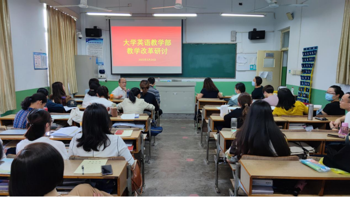 为促进学习贯彻习近平新时代中国特色社会主义思想主题教育扎实开展,做实做好“我为群众办实事”实践活动,5月24日下午,大学英语教学部在文科楼207举办大学英语教学部教学改革研讨活动。本次活动校教学督导员应邀参加,由教学部主任韩建侠主持,全体教师参加。