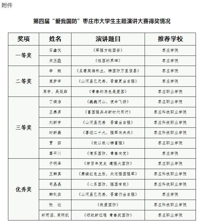 近日,由枣庄市委宣传部、团市委、市教育局、枣庄军分区政治工作处等部门联合举办的第四届“爱我国防”枣庄市大学生主题演讲大赛结果公布。永利官网推荐学生6名,获奖6名。其中,一等奖2名;二等奖2名;三等奖1名;优秀奖1名。