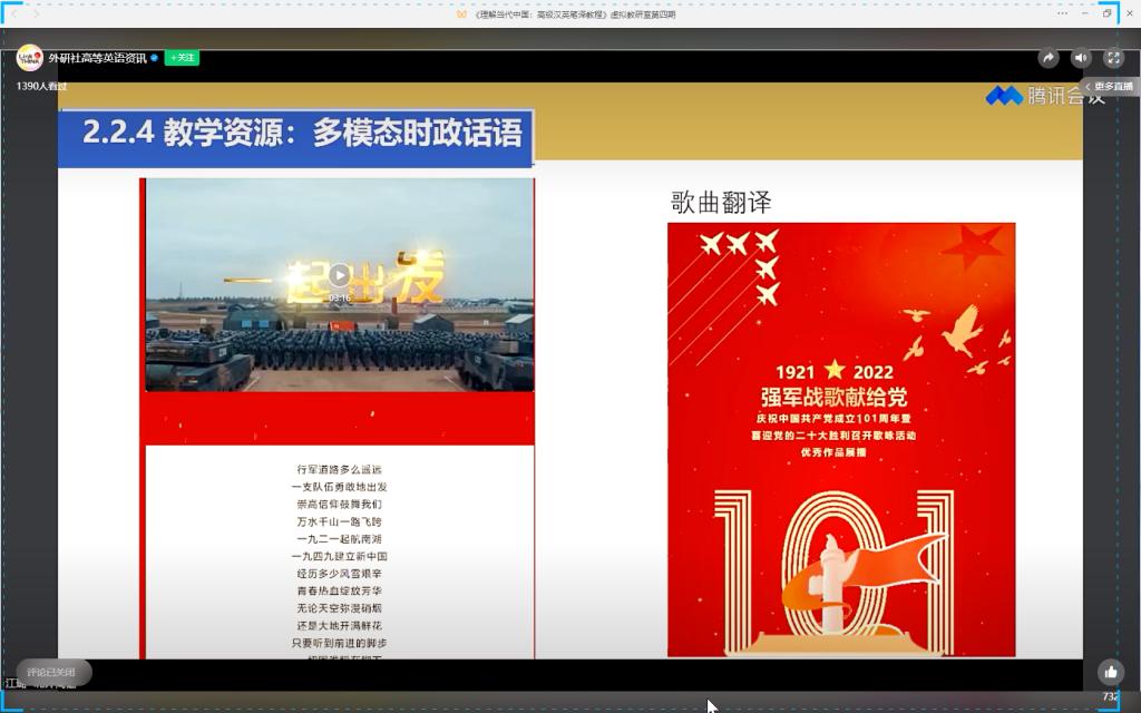 为推动学院“三进”教学工作有序开展,促进“理解当代中国”系列教材课程平台建设,外国语学院组织全体专任老师参加了外研社3月下旬以来举办的高等学校“理解当代中国”系列教材虚拟教研室活动。