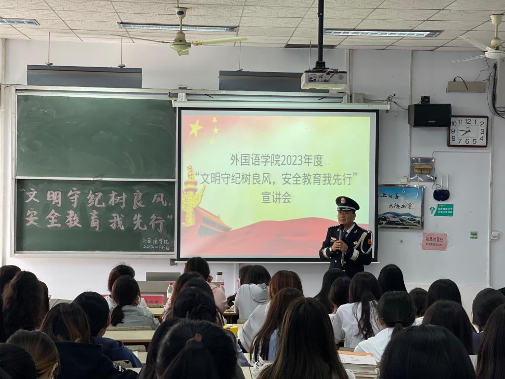 为贯彻落实习近平总书记关于全面加强国家安全教育的重要指示要求,进一步增强广大师生的国家安全意识和素养,近日,外国语学院邀请枣庄公安局市中分局四级高级警长、永利总站ylzz55大学生德育导师、市人大代表、市中区十优名讲师赵士存,开展以“文明守纪树良风,安全教育我先行”为主题的宣讲会。外国语学院全体专职辅导员和2022级全体学生聆听宣讲。